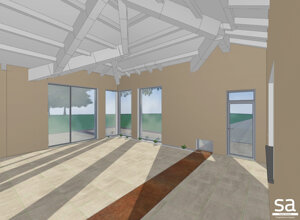 Sin dalle fasi progettuali preliminari è stata posta particolare cura alla copertura in legno lamellare mediante un'attenta analisi delle altezze interne nonché delle sezioni delle travi, ancorate mediante piastre a scomparsa al cordolo in c.a. sovrastante le murature portanti.