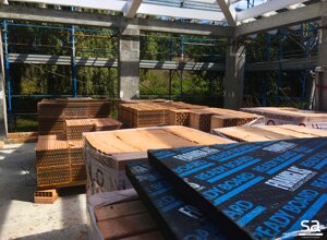 L’edificio si sviluppa su un solido corpo strutturale realizzato con pilastri in cemento armato, collegati tra loro da un cordolo che ne garantisce la stabilità. La copertura è realizzata con travi e arcarecci in legno lamellare di classe GL24H, una soluzione che unisce resistenza e leggerezza, offrendo anche un tocco estetico naturale.